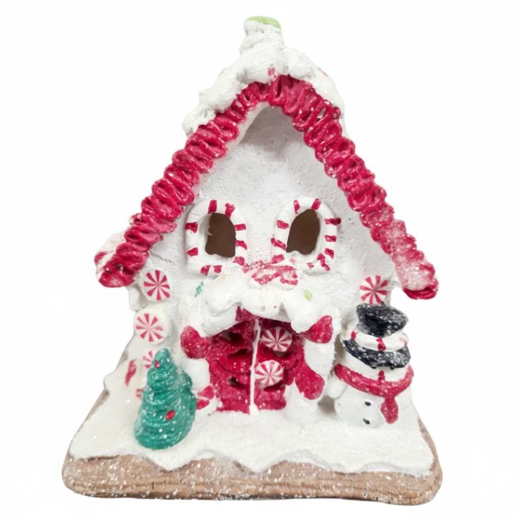 This white gingerbread house is beautifully decorated with intricate icing designs and colorful candy accents. Its charming, snowy appearance makes it a delightful addition to your holiday décor, evoking a warm and festive spirit perfect for Christmas celebrations.